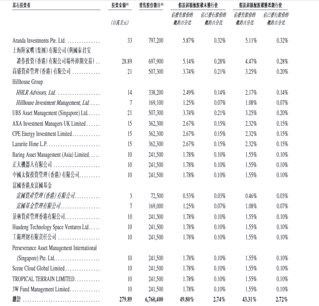 值得一提的是,思格新能本次IPO获顶流资本加持,基石投资者阵容堪称豪华。据公司公告内容,公司此次发行吸引了Aranda Investments Pte、上海陆家嘴(集团)有限公司、高盛资产管理(香港)有限公司、Hillhouse Group、UBS Asset Management、AXA Investment Managers UK Limited、CPE Energy Investment Limited、Lazurite Hime LP、Baring Asset Management (Asia) Limited、正大机器人有限公司、中国太保投资管理(香港)有限公司、富国资产管理(香港)有限公司、富国基金管理有限公司、景林资产管理香港有限公司、Huadeng Technology Space Ventures、工银理财有限责任公司、Perseverance Asset Management International (Singapore) Pte、Scene Cloud Global Limited、TROPICAL TERRAIN LIMITED、3W Fund Management Limited等基石投资者参与认购,合计认购约2.8亿美元,占全球发售股份的49.80%。